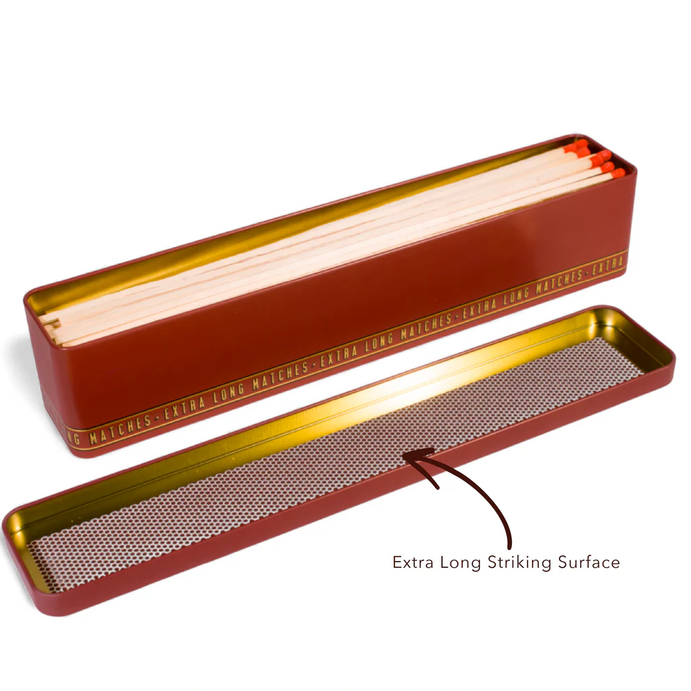 Measuring 295x52×52 mm, these elegantly crafted tins are designed to hold up to 100 extra-long matches (28 cm), giving you a safer reach when lighting fireplaces, stoves, candles, or outdoor fires.