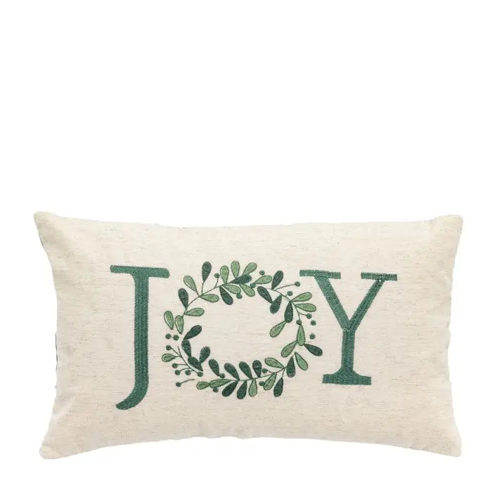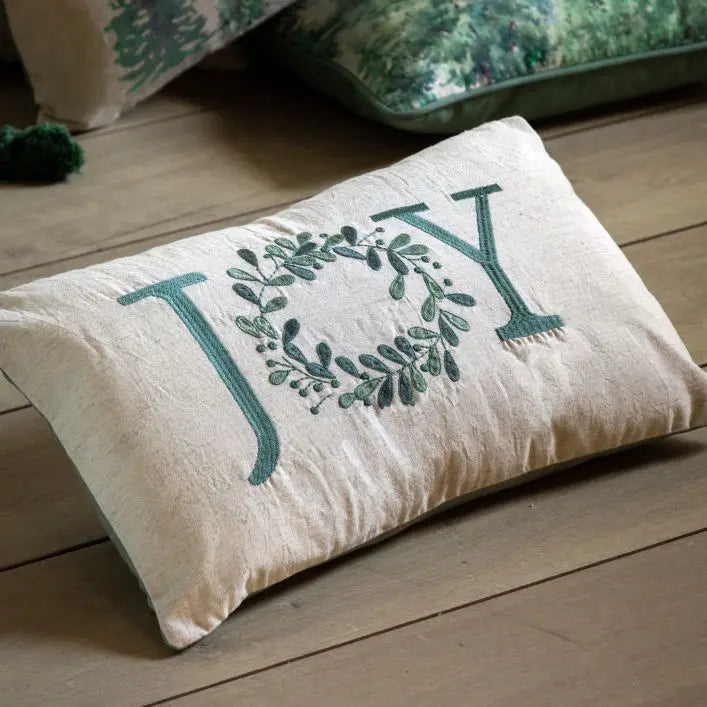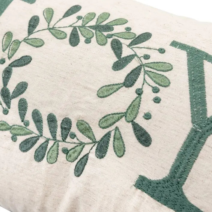 Add a little Christmas joy to your home this festive season. Against a simple beige linen backdrop, an embroidered mistletoe wreath makes up the joy on this cushion, it's sure to add some comfort and cheer to any room.