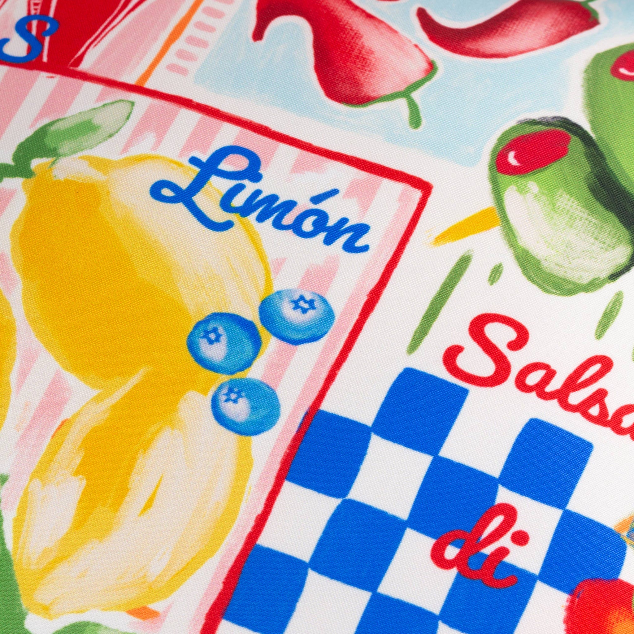 Transform any outdoor space into a Mediterranean escape with this vibrant picnic-themed cushion. Featuring watercolour illustrations of sardines, olives, Padron peppers and citrus fruits, this shower-proof design adds instant warmth and character to conservatories, patios or any outdoor area.