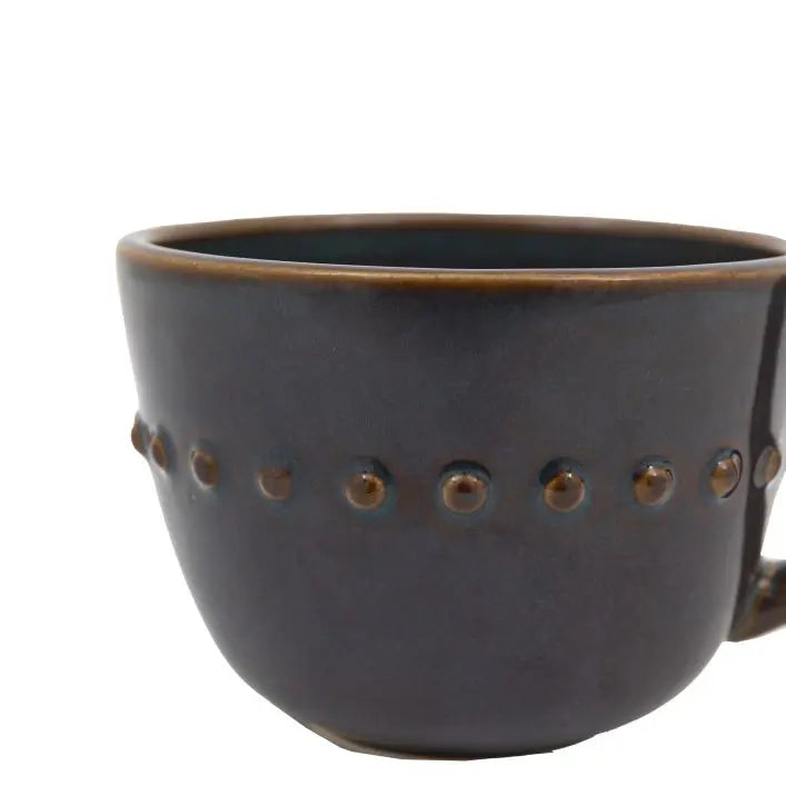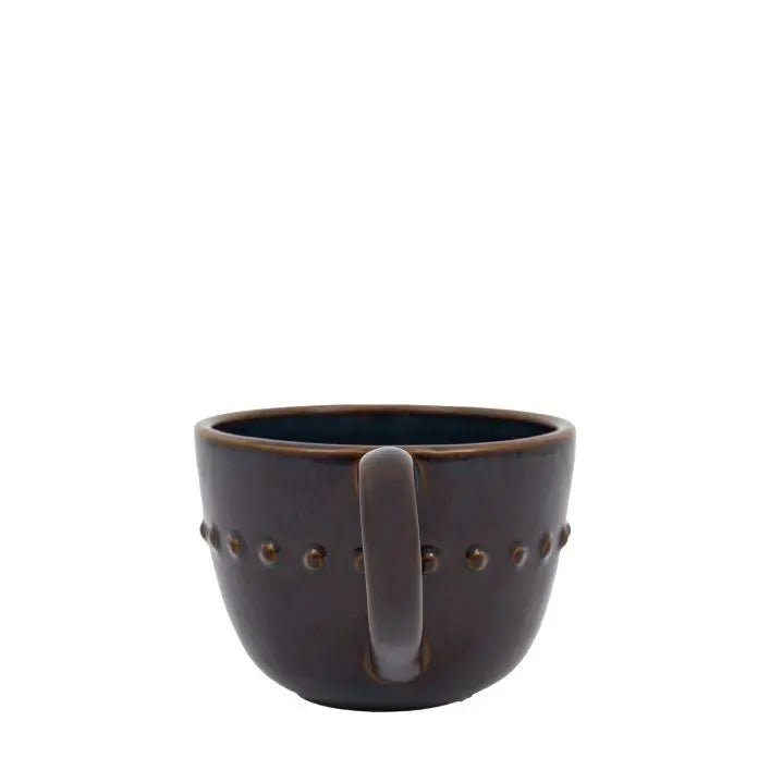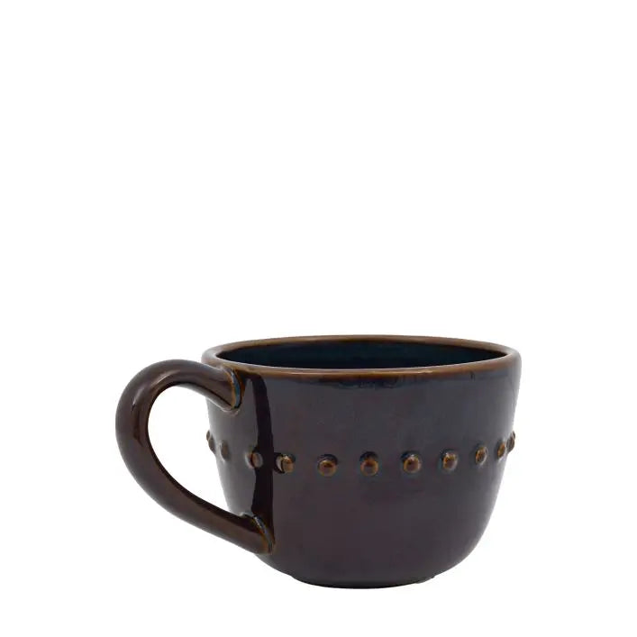 These beautifully organic mugs evoke a true sense of the term hand crafted. Put through several layers of kiln firing, the reactive nature of this 'slip' glaze style ensures that each mug reacts in the kiln slightly differently, offering a sense of uniqueness to every piece. The rich ink blue glaze is offset by the warm brown base colour, visible on the handle and across the horizontal bead pattern.
