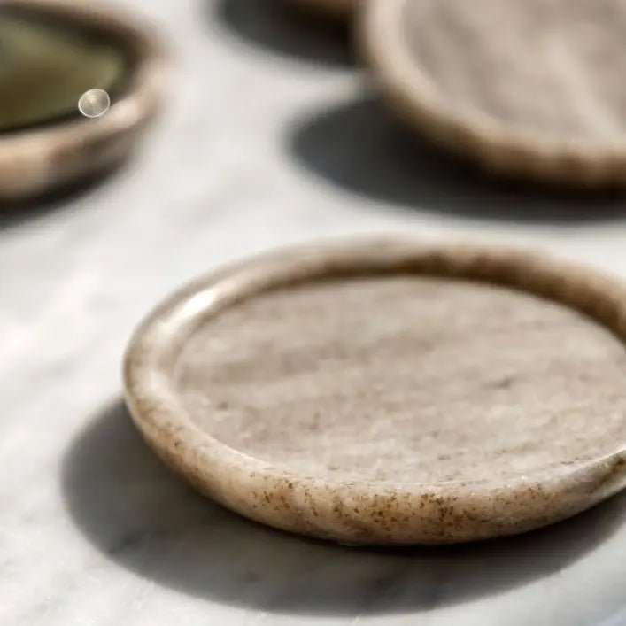 Hand carved from stunning natural marble this set of 4 coasters add a sophisticated and stylish touch to any table or bar. Foam pads on the base of each coaster.