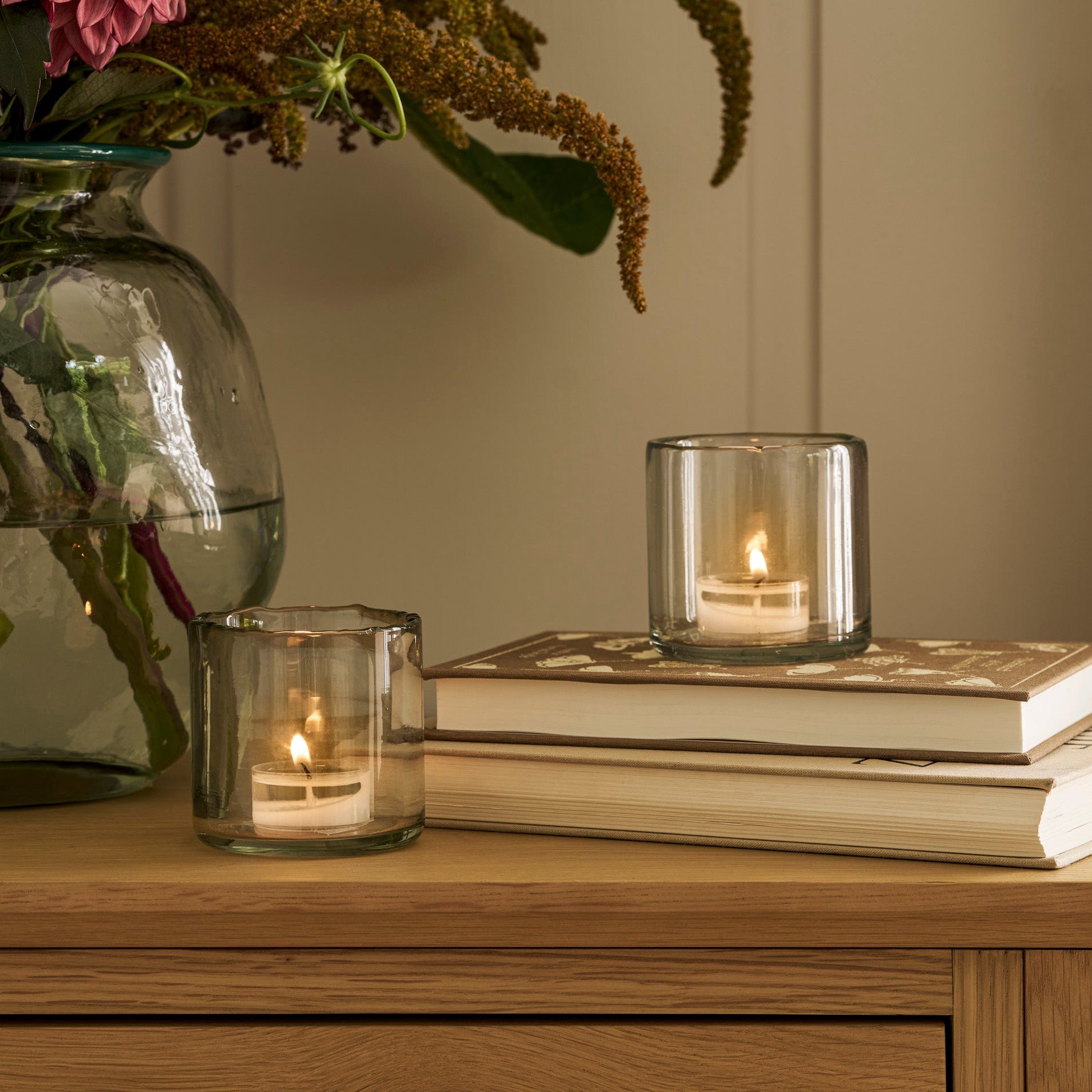 Get set for cosy nights in with the Avebury Tealight Holders. Made from recycled glass, these simple glass tealight holders have an organic edge that gives them a rustic feel, also making each one unique. Place this set of two either end of a mantelpiece or use them on the dinner table to create an atmospheric glow.