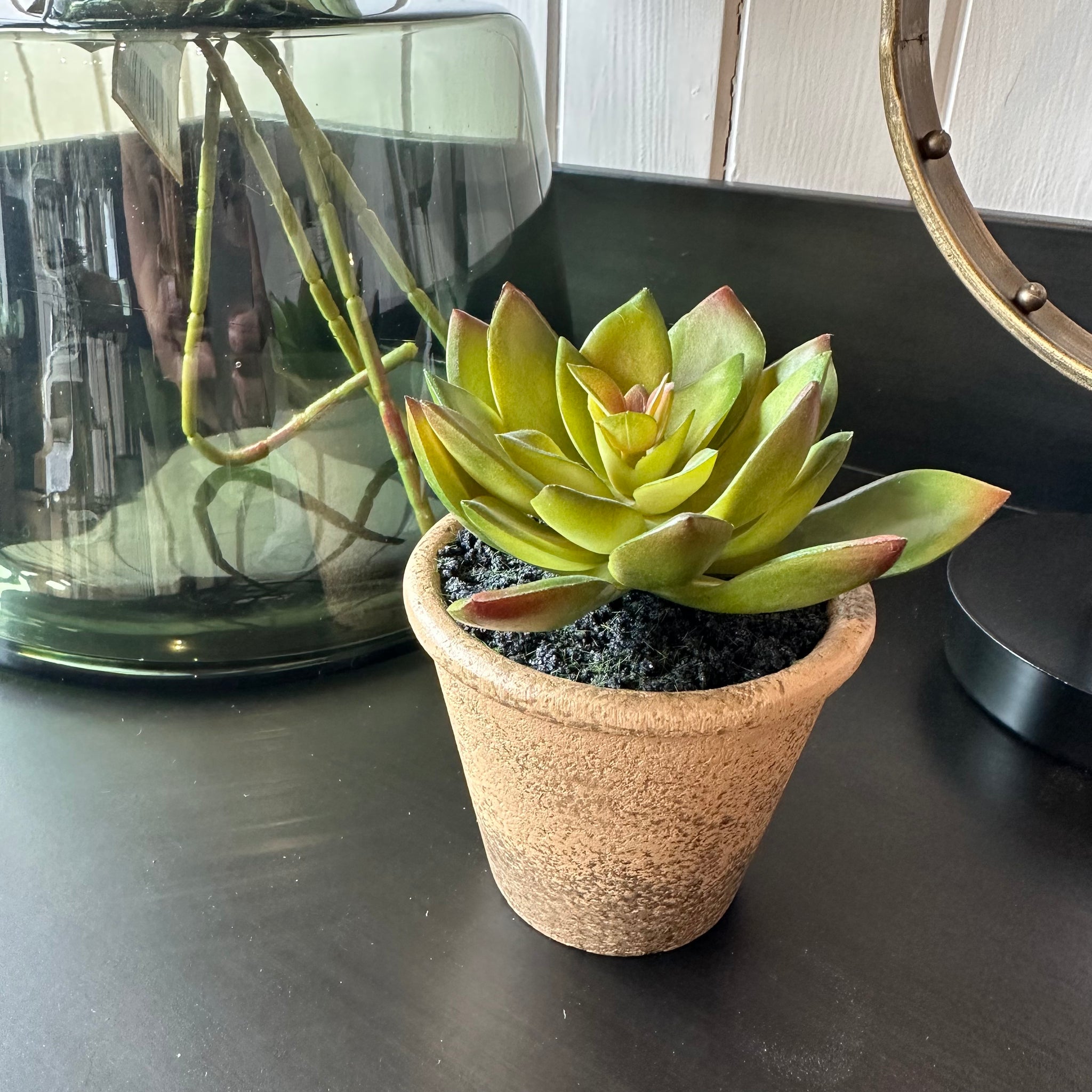 This small echeveria is potted in an aged terracotta style pot. This faux succulent is a great styling addition to bookcases, shelves and coffee tables.
