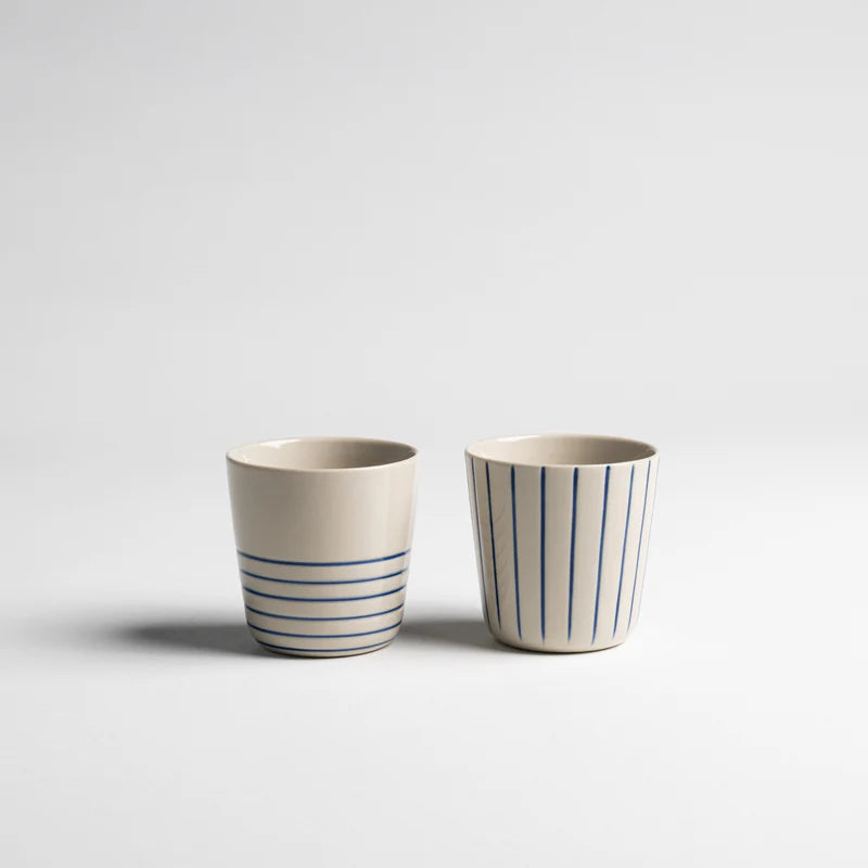 Each beaker features hand-etched patterns — one with bold vertical lines, the other with a soft circular design — etched using simple tools and hand-painted with care. The smooth gloss finish feels beautiful to hold, while the subtle imperfections of the handmade process make each one uniquely yours.